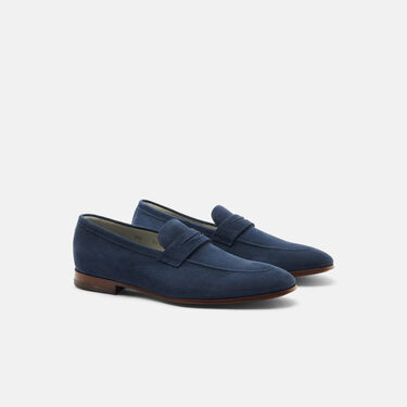 • Unser Pennyloafer 'Marzio Abisso Scamosciato' aus unserer flexiblen Sohlenfamilie wurde von erfahrenen Schuhmachern in unserer Manufaktur in Italien auf einem italienischen Leisten gefertigt. Der Schuh ist aus dunkelblauem Rauleder gefertigt und hat ein weißes Innenfutter aus perforiertem Leder, das den Schuh sehr bequem macht, aber auch die natürliche Atmungsaktivität des Leders fördert. Dieser Loafer ist in der Blake-Rapid-Machart vernäht und hat eine Ledersohle aus Fettleder, die den Schuh besonders flexibel macht und außergewöhnlichen Komfort bietet, perfekt für den Sommer.