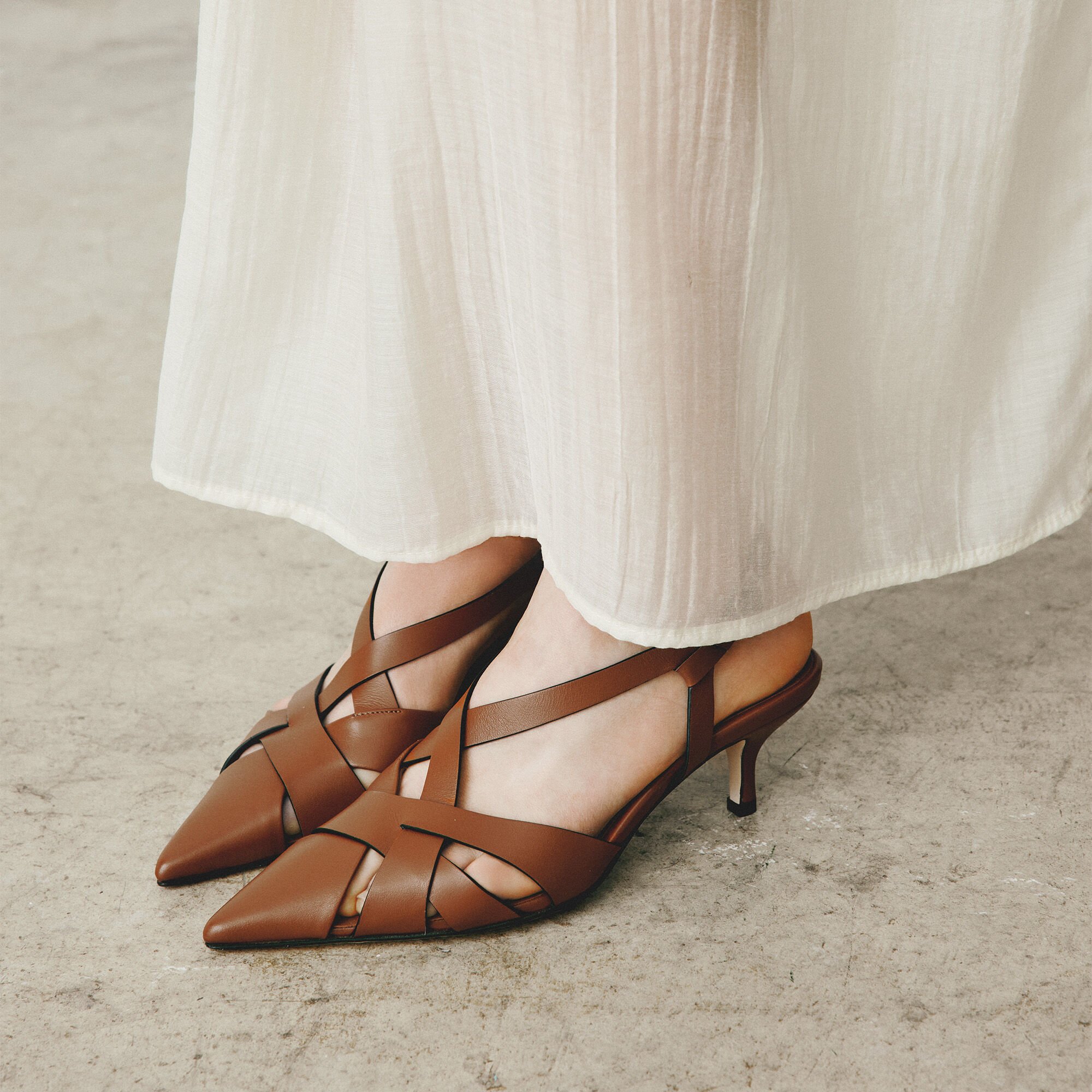 • Décolleté slingback a punta in pelle di vitello cuoio con lavorazione ad intreccio e dettaglio cut-out, chiusura slingback e tacco stiletto.